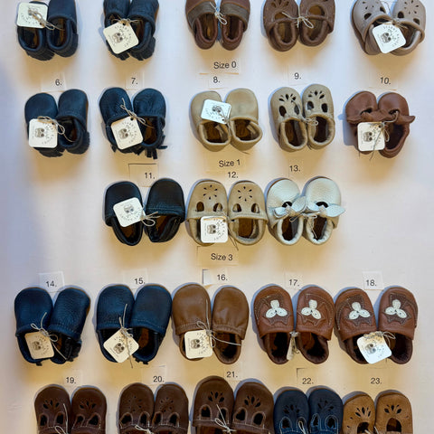 20plus choices of shoes with designs sewn on in bright leather colors with fun designs